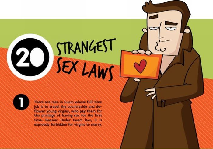Did you know that it's illegal to marry a virgin in Guam and there are actualy men whose job is to deflorate all virgins in the country? Weird and old-fashioned? Maybe. But there is a similar law in the state of Washington. You may not have sex with a virgin, even on the wedding night. Wait, what??? Let's read about more strange sex laws.